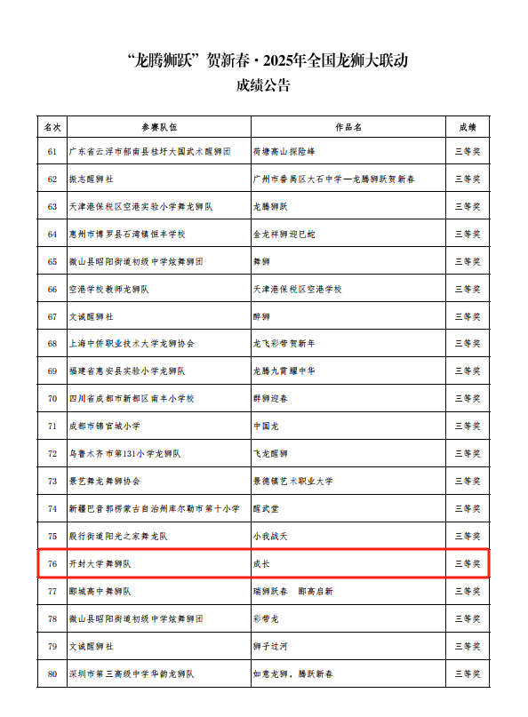 近日,在中国龙狮运动协会“龙腾狮跃”贺新春·2025中国龙狮大联动活动中,365官网舞狮社团的参赛作品《成长》荣获三等奖。