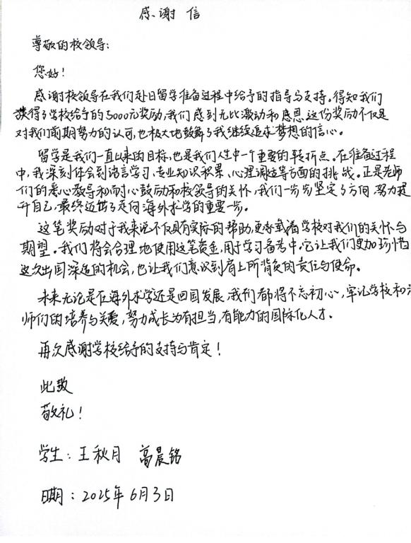 本站讯  近日,365官网国际教育学院(外国语学院)应用日语专业交换生王秋月、高晨铭从日本观光大学传来佳讯,两位同学以优异表现荣获365英国上市集团官网交换生项目学业优秀奖学金,并联合致信学校,深情表达对学校悉心培养的感激之情,字里行间洋溢着对师长教诲的感恩与对专业成长的热忱。