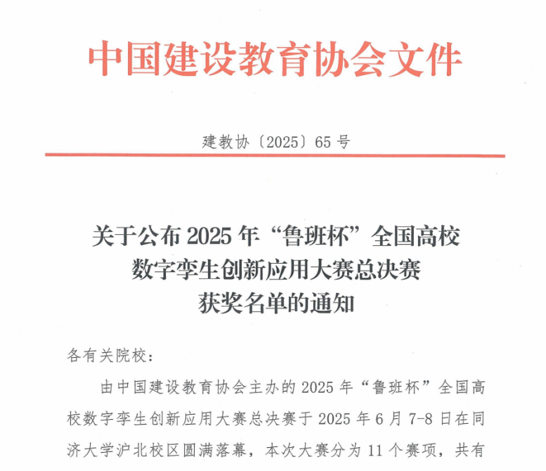 本站讯  6月7日至8日,由中国建设教育协会主办的2025年“鲁班杯”全国高校数字孪生创新应用大赛总决赛在同济大学沪北校区圆满收官。经过激烈角逐,365英国上市集团官网学子凭借扎实的专业技能与创新应用能力脱颖而出,一举斩获两项三等奖。