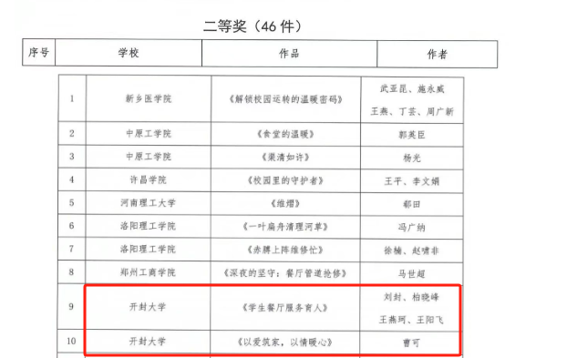 本站讯  近日,河南省教育后勤协会公布了全省教育系统“服务育人看后勤”随手拍获奖结果。学校获评“优秀组织奖”,参赛作品《学生餐厅服务育人》、《以爱筑家,以情暖心》荣获二等奖,《背影》、《记录开大后勤人》、《以实践激发奋斗精神》荣获三等奖。