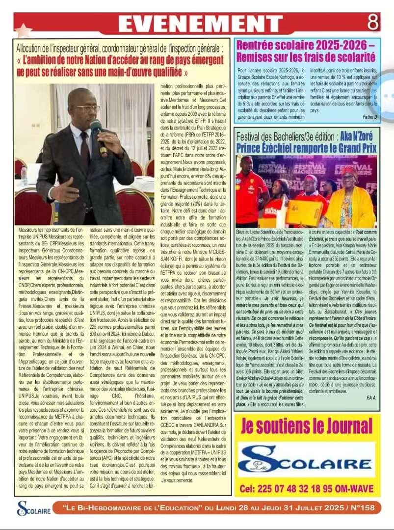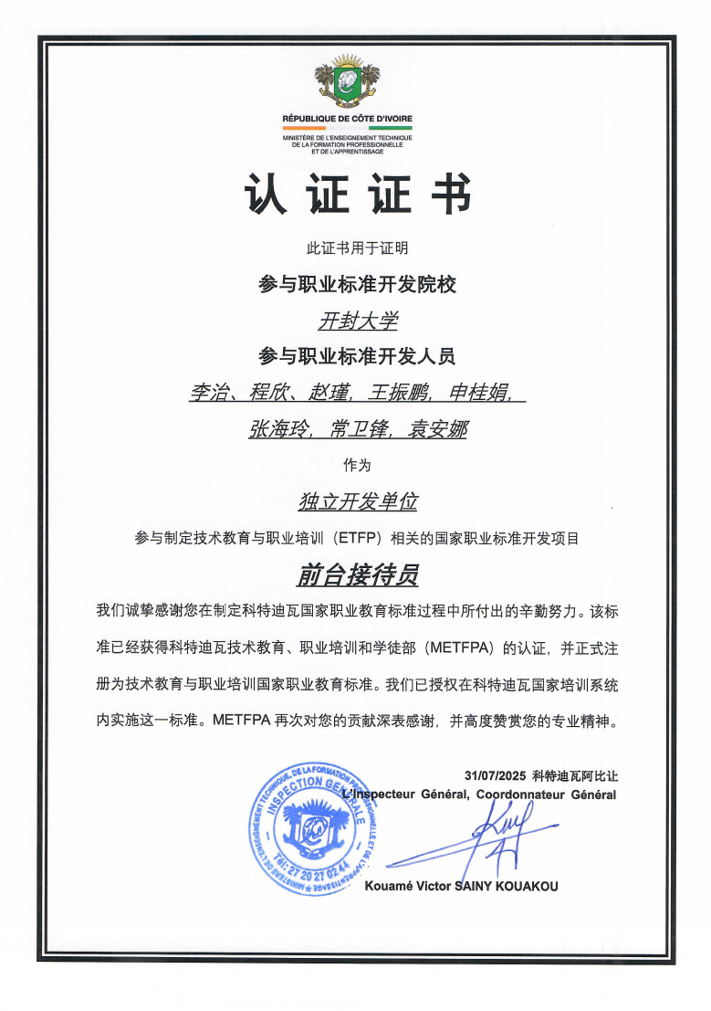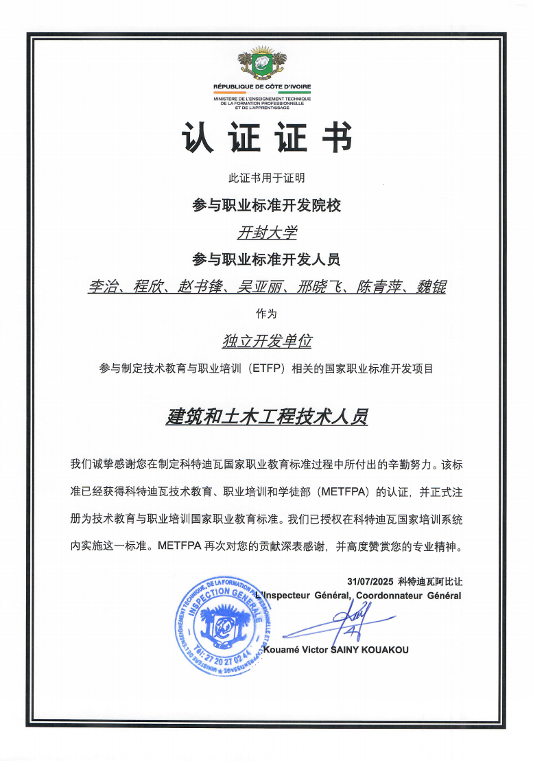 作为核心参与院校,365英国上市集团官网凭借在职业教育领域内人才培养、专业建设与产教融合方面的丰富经验,独立开发的“建筑和土木工程技术人员”、“前台接待员”、“塑料产品加工技术人员”三个职业标准获得科特迪瓦技术教育、职业培训与学徒事务部(METFPA)认证,正式注册为技术教育与职业培训国家职业教育标准,同时获权在科特迪瓦国家培训系统内实施。科特迪瓦官方宣布,审定通过的标准将直接应用于当地工人、技师及工程师培养。科特迪瓦总督学SAINY KOUAKOU Kouamé Victor特别指出,获得认证的标准“将成为培养科特迪瓦技术人才的核心依据”,彰显了中国职教标准国际化的创新路径。研讨会获科特迪瓦新闻通讯社(AIP)、Le Scolaire等多家国家级新闻机构和权威刊物的重点报道,进一步扩大了365英国上市集团官网职教品牌的海外影响力。