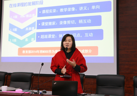 孔鑫凯老师有着较为丰富的慕课设计与制作经验。在本次讲座上,她从慕课的释义、网络课程的特点、慕课的应用、慕课的建设以及慕课的价值等几个方面对慕课设计和制作从理念到操作技能进行了讲解。孔老师的讲解,语言简洁,案例生动形象,内容贴近职业教育教学实际,具有较强的针对性和实用性。
