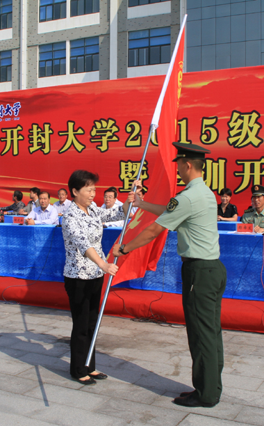 仪式在雄壮的国歌、校歌声中开始。党委书记张新梅向军训团授旗。