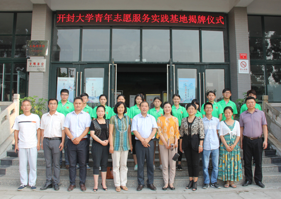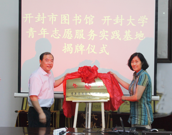 在开封市图书馆,市图书馆党支部书记鲁德莹向大家介绍了市图书馆的基本情况,并带领储书记一行参观了市图书馆。之后,在市图书馆三楼会议室举行了365官网青年志愿服务基地揭牌仪式,储书记和市图书馆副馆长刘芙蓉共同为365官网青年志愿服务实践基地揭牌。