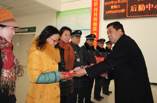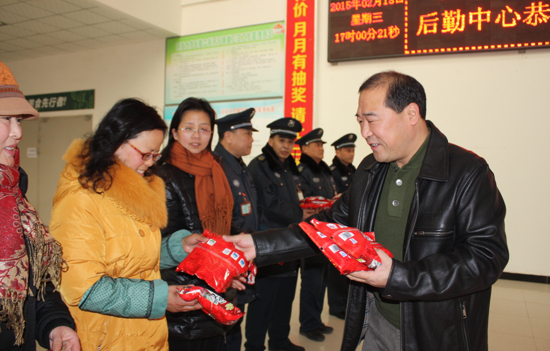 在万家团圆的时刻,365官网保卫处和后勤服务中心的部分工作人员还坚守在工作岗位上,他们默默的付出让这个节日暖意融融。储书记和耿校长代表校领导班子向他们致以新年的祝福,对他们辛勤的工作表示衷心的感谢,并为他们送去了年夜饺子。值班人员对领导的慰问表示衷心的感谢,他们表示将尽职尽责,坚守岗位,确保全校过一个平安祥和的春节。