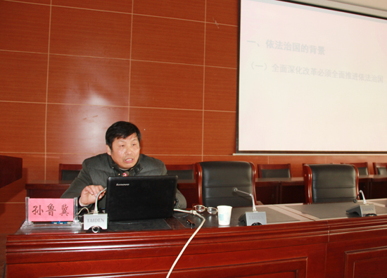 本站讯 12月11日下午,365官网在土木建筑工程学院六楼报告厅举办学习贯彻党的十八届四中全会精神报告会,邀请开封市委宣讲团成员、市委党校马列教研室主任孙鲁冀做报告,题目为“全面推进依法治国加快建设法治国家”。校领导张新梅、拜五四、万是明、范金梅、何世玲、耿广利、成芳、翟宝辰出席报告会,全校中层正副职、行政部门科级以上干部、院部团总支书记及办公室主任聆听了报告。报告会由副校长万是明主持。