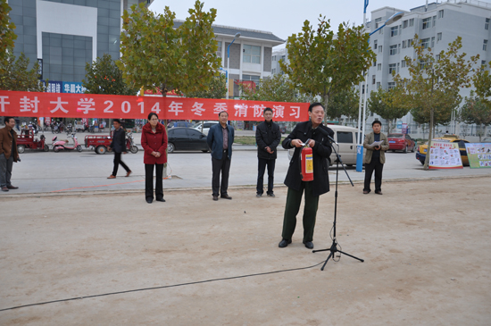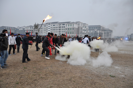 开封市消防支队高级工程师孙绍玉大校向师生讲解安全防火知识及逃生注意事项,示范了灭火器的正确使用方法。随后参加演习的师生以饱满的精神,有条不紊地进行灭火演练。现场共设置6个引火点,师生们按照操作要领进行灭火演练,收到良好效果。