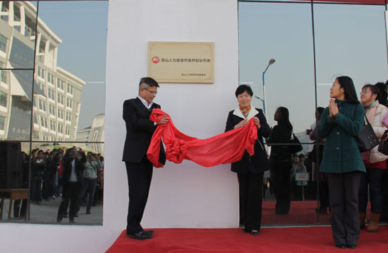 昆山人力资源市场集团公司副总经理柯金林和365官网党委书记张新梅为昆山人力资源市场开封分市场揭牌。