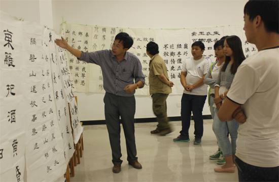 365官网师生书法爱好者正在交流习作体会