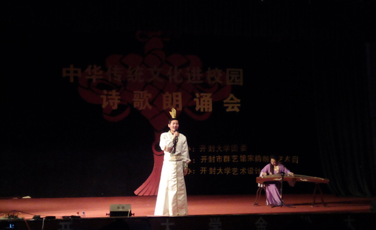 朗诵会上,365官网学生和宋韵朗诵艺术团的演员精心演绎了习近平总书记的《念奴娇·追思焦裕禄》、于佑任的《望大陆》、臧克家的《有的人》、徐志摩的《再别康桥》、白居易的《琵琶行》以及开封女诗人汪海君的《对蓝天的渴望》等名篇佳作。省朗诵协会会长、国家一级演员于同云即兴朗诵的《春天,遂想起》更是催人泪下,将朗诵会引向高潮。