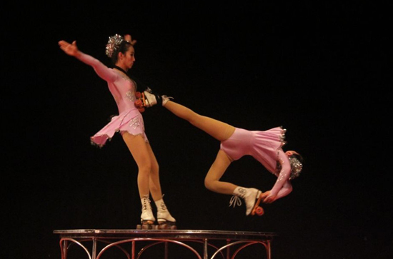 表演中,演员们个个身怀绝,转碟表演时,演员们用各自双手举着三根长约一米,粗如铅笔的竿子,每个杆子均顶着一个碟子,晃动旋转,看上去似迎风而立的荷叶,又若飞舞的彩蝶,优美而抒情,她们健美的身材以及协调的舞步融入在欢快的音乐中。紧接着,滑轮表演开始,两位演员在一个圆桌上进行表演,场面之惊险,速度之快而又不失美感,让人叹为观止。表演层出不穷,将晚会的气氛一次又一次推向高潮,台下掌声欢呼响成一片。