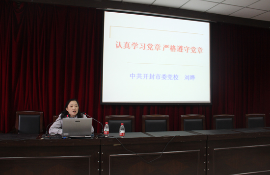 开封市委党校党史党建教研室主任刘晔教授为大家做了“认真学习党章 严格遵守党章”专题讲座。刘教授重点围绕党章的基本精神和十八大党章修改的主要内容展开,重点讲述了十八大党章修改的主要内容:一是对科学发展观作出新的定位和阐述;二是充实完善中国特色社会主义重要成就的内容;三是充实了坚持改革开放的内容;四是充实了中国特色社会主义总体布局的内容;五是充实完善关于党的建设总体要求的内容;六是对党章部分条文作了适当修改。