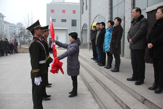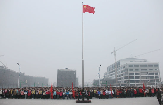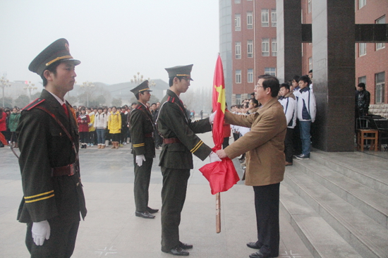 校升旗手分别从党委书记张新梅和校长拜五四手中迎过国旗,将神圣的国旗冉冉升起,全校师生行注目礼。党委副书记储建新、副校长万是明分别在两个校区讲话,两名学生代表发言。