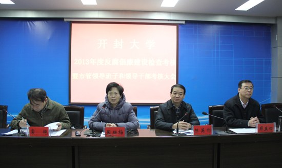 本站讯 12月26日上午,以市委组织部副部长陈英利为组长、市纪委廉自办主任常艳为副组长的市委考核组一行7人对365官网党政领导班子及市管领导干部进行2013年度考核。校党委书记张新梅、校长拜五四,全体校级领导及中层正职干部、各民主党派负责人、正高职称人员参加了会议,会议由党委书记张新梅主持。
