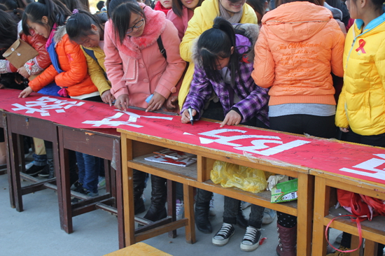 师生在“预防艾滋,共建美好家园”横幅上签字