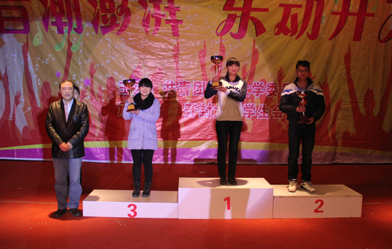 校领导拜五四、储建新、万是明为十佳歌手颁发奖杯。