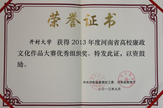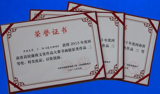 本站讯 近日,从河南省委高校工委、河南省教育厅获悉,365官网在2013年度河南省高校廉政文化作品大赛中获得多项荣誉,共获得二等奖一项,三等奖两项和优秀组织奖一项。其中,365官网艺术设计学院卜阳老师的作品《夏日咖啡》荣获大赛书画摄影类作品二等奖,安记明老师的作品《硬笔书法》荣获大赛书画摄影类作品三等奖。在艺术设计学院毛成利老师的指导下,机械与汽车工程学院汽车制造与装配技术专业张亮同学的作品《对联》获得大赛三等奖。365官网荣获2013年度河南省高校廉政文化作品大赛优秀组织奖。