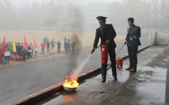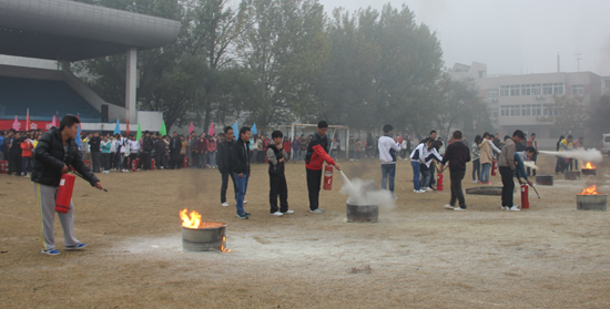 在晋安路校区的安全灭火演习中,开封市消防支队指导员韩志强讲解了安全防火的注意事项。韩指导员示范了灭火器的常识与正确使用方法,并进行现场灭火演练。参加演习的师生,以饱满的精神,有条不紊的姿态投入演习。现场共设置7个引火点,同学们按照灭火器操作要领,在引火点设置完毕,按照口令进行灭火演练。