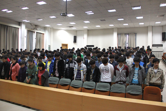雅安市芦山县发生地震,人民生命财产遭受严重损失,灾区的情况牵动着每一位中国人的心,也牵动着全院师生的心。在仪式上,11级模具设计与制造2班四川雅安籍学生姜何向大家讲述了家乡受灾后,自己家庭的情况,同时十分感谢学校领导、老师们、同学们对他的关心与帮助,及时给他送去温暖,使他能积极乐观地面对,安心地学习和生活。