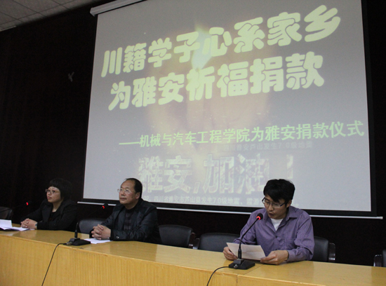 本站讯 4月24日下午6点30分,机械与汽车工程学院在晋安路校区报告厅举行“川籍学子心系家乡,为雅安祈福捐款”的活动。机械与汽车工程学院院党总支书记马广卿,部分教师、学生,四川籍学生代表参加捐款仪式。