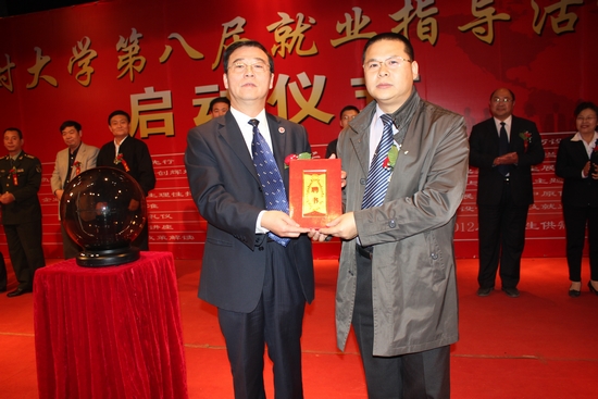 校长拜五四在启动仪式上向全国就业指导知名专家李震东教授颁发特聘教授证书。
