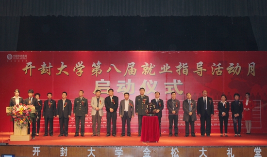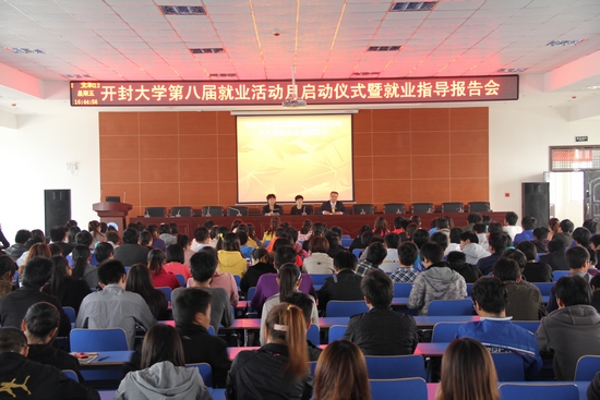 本站讯 10月26日下午,365官网在晋安路校区金松大礼堂举行第八届就业指导活动月启动仪式。河南省教育厅就业服务中心市场信息部主任马旭辉,开封军分区副司令员兼参谋长张中华,开封市人力资源和社会保障局副局长程崇正,开封市教育局党委书记常跃进,开封市教育局局长郑西乾,开封市人才交流中心主任姜慧勇,金明区武装部部长秦志国,开封万盛新材料有限公司总经理李军涛,开封奇瑞重工综合管理部安海,全国就业指导专家李震东,365官网领导拜五四,万是明,范金梅,何世玲,成芳出席仪式,各院部相关负责人及1500余名师生参加了启动仪式。