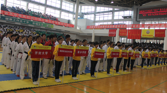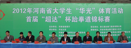 本站讯 10月27日上午,2012年河南省大学生“华光”体育活动——首届“超达”杯跆拳道锦标赛开幕式在365官网晋安路校区体育馆举行。河南省学生体育总会高校协会主席林克明,河南省重竞技运动管理中心党委书记戴云鹏,365官网党委副书记、河南省学生体育总会跆拳道协会主席储建新等出席开幕式。开幕式由河南省学生体育总会跆拳道协会秘书长胡红权主持。