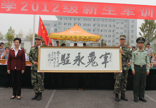 副校长万是明代表学校党委、行政讲话。万校长首先向承训部队首长、教官表示诚挚的感谢,并向圆满完成军训任务的新生表示热烈的祝贺!万校长说,经过为期11天严格的军事训练,四千余名新同学圆满完成了各项训练任务,希望同学们以这次训练为契机,以教官为楷模,以严谨的作风为准绳,将自强不息的精神,投入到以后的学习和生活中去,以良好心态去接受人生的挑战。奋发学习,挑起建设祖国的重担。