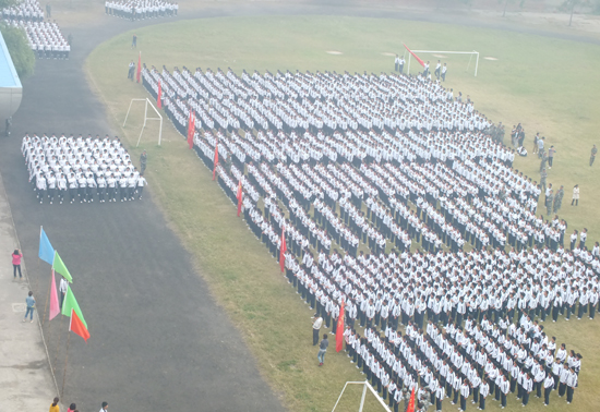 闭营式在雄壮的国歌声中开始。首先,校党委书记张新梅在军训教官的陪同下检阅了2012级新生军训营队。随后各学院进行了精彩的队列汇报表演,东京大道校区教官还进行了威武的团体操表演。