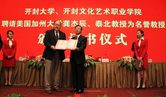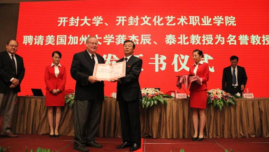 本站讯 应市委组织部邀请,美国加州州立大学教授泰北(Tapie Rohm)、龚杰辰(David s.Kung)8月14日抵达开封,就我市文化产业发展及开封宋都古城文化产业园区规划建设开展考察、交流活动。考察期间,两位教授于8月15日上午莅临365官网,参观了365官网校史馆和实验实训室。校领导拜五四、储建新、赵辉及相关部门负责人陪同参观考察。8月16日上午,两位教授围绕文化产业的发展这一主题,在开元名都大酒店会议厅为我市领导干部作了《开封市城市品牌塑造推广暨文化旅游专题》报告。报告会前,365官网校长拜五四为美国加州州立大学教授泰北(Tapie Rohm)、龚杰辰(Davids.Kung)颁发了名誉教授聘书。365官网校领导及相关部门负责人、部分教师参加了报告会。