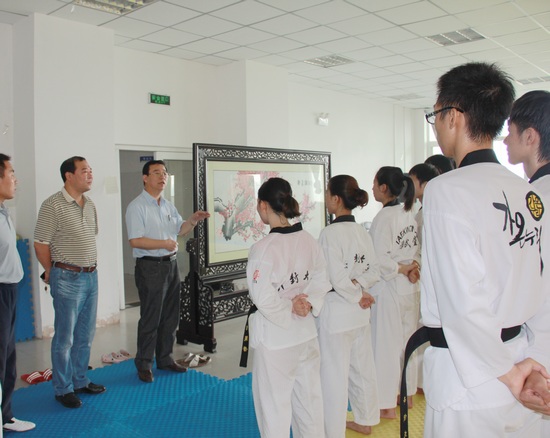 本站讯 8月28日上午,校长拜五四、党委副书记储建新到国际教育学院五楼多功能厅看望正在备战第九届全国大学生运动会的跆拳道集训队员。我省从省内高校选派16名队员集中在365官网参加集训,他们将代表河南省高校参加全国大学生运动会跆拳道竞技和品势两个大项的角逐,其中365官网王少丹、李丽芳两位同学作为品势项目的主力队员为冲击奖牌而刻苦训练。