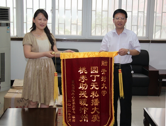 开封市残疾儿童康复中心向365官网赠送“园丁无私播大爱,桃李助残暖汴州”的锦旗,对365官网的志愿爱心服务表示感谢。