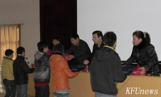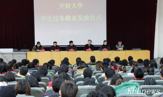 随后,校领导为2011级272名学生发放了过冬棉衣。