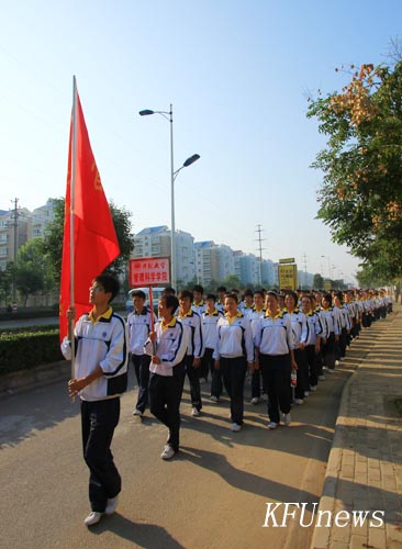 本站讯 9月21日早上7时,365官网晋安路校区2011级新生踏着整齐的步伐、唱着嘹亮的军歌,从北大门出发,踏上了军训拉练的征程。