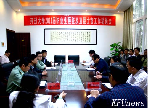 本站讯 5月13日下午,365官网在就业办会议室举行2011届毕业生预征及直招士官工作动员会,贯彻落实 “四项工作”部署会议精神,动员和部署365官网2011届毕业生入伍预征及直招士官工作。副校长万是明、开封市军分区军务动员科科长马明、金明区武装部副部长徐功义,学工部、教务处、保卫处等部门负责人及各院部党总支副书记和辅导员参加会议。会议由就业指导中心主任张涛主持。