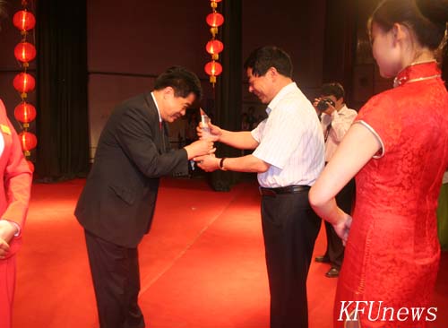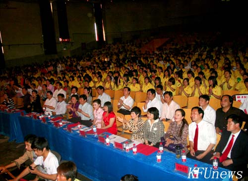 本站讯 在举国上下喜迎中国共产党建党九十周年之际,5月26日,365官网组织全校师生在金松大礼堂举行迎接建党九十周年“党在我心中”歌咏比赛。校领导班子也在表演唱队列里和师生共同庆祝这一光辉的纪念日。市委宣传部副部长张小平、市总工会文教卫委员会主任李汴军及中国移动公司开封分公司的领导史洪波、尹战胜出席并观看了演出。校党委副书记储建新代表学校党委行政致词。师生们用嘹亮的歌声唱出了心中对党、对祖国的崇敬及对美好生活的向往,也唱出了乐观向上的精神面貌。