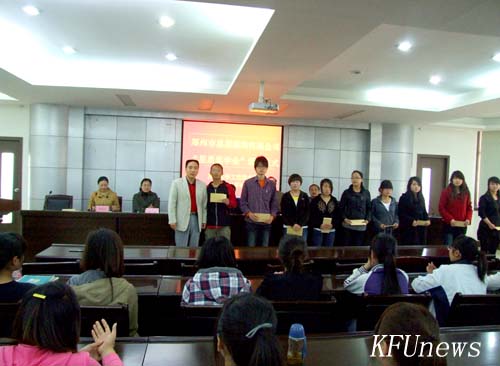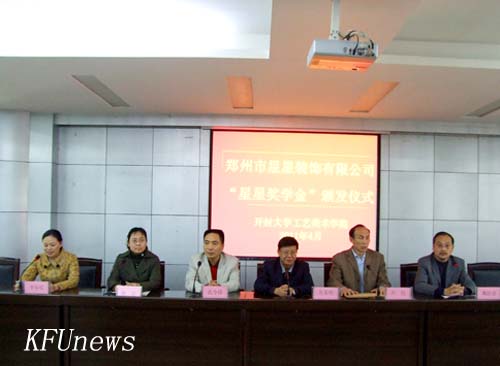 本站讯 4月13日上午,工艺美术学院首届“星星奖学金”发放仪式在行政楼二楼会议室隆重举行。出席仪式的有星星装饰有限公司孔令伟董事长,万是明副校长,学生工作部部长陈岩以及工艺美术学院的部分师生。本届奖学金共有王泽南等10名学生获得奖励和资助。