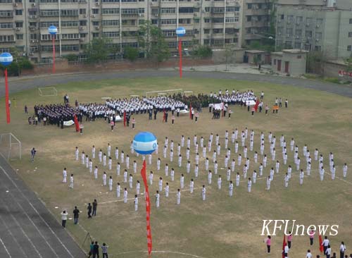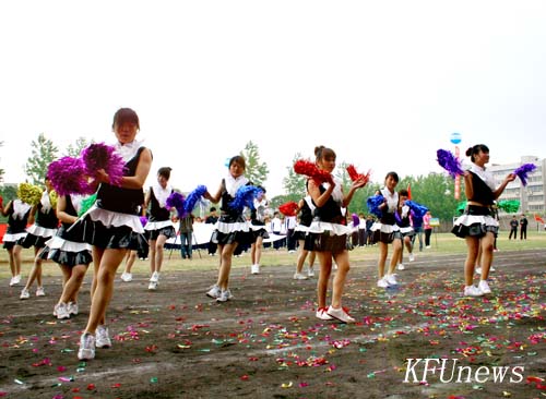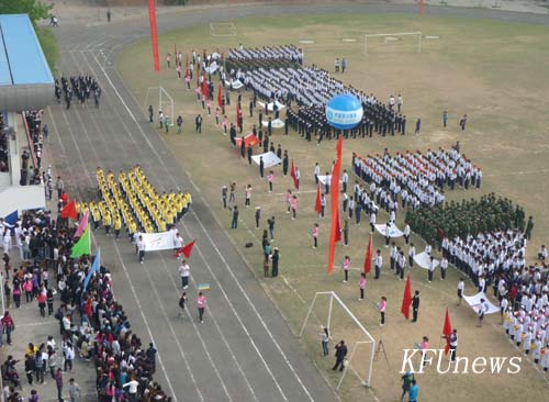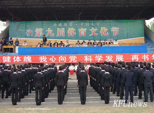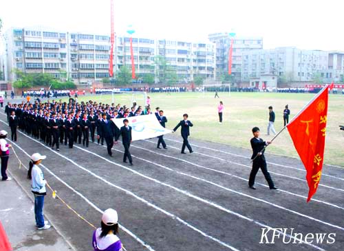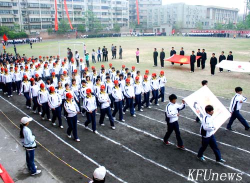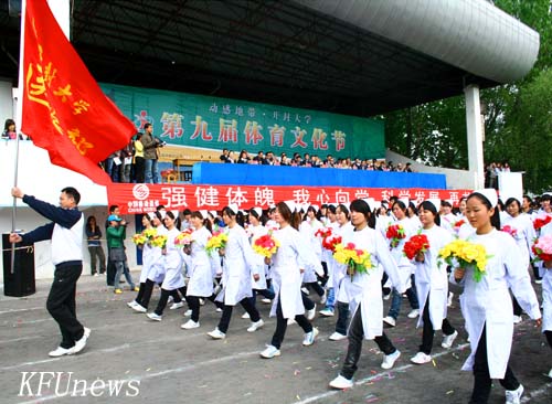 入场式列队表演是开幕式上的一个亮点,13个院部列队依次入场,并穿插精彩表演,那整齐划一的队列,彰显专业特色的激情表演,体现了开大人健康乐观、积极向上的精神风貌。