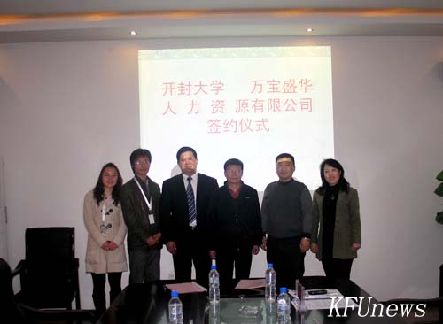 365英国上市集团官网就业指导服务中心主任张涛、河南万宝盛华人力资源有限公司总经理黎明签订了“365英国上市集团官网学生就业实习实训基地项目”协议,随后,双方与会人员合影留念。