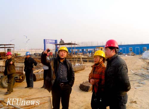 本站讯 2011年3月11日下午,北校区建设指挥部指挥长、党委副书记、副校长储建新,指挥部政委、工会主席、纪委书记范金梅,在指挥部工作人员的陪同下巡查东京大道校区建设工地。