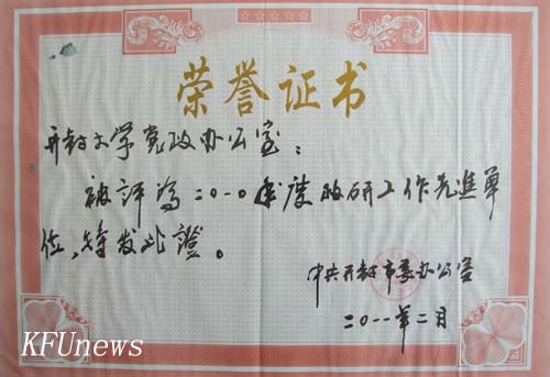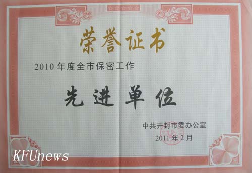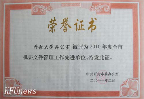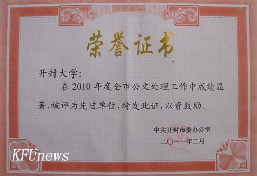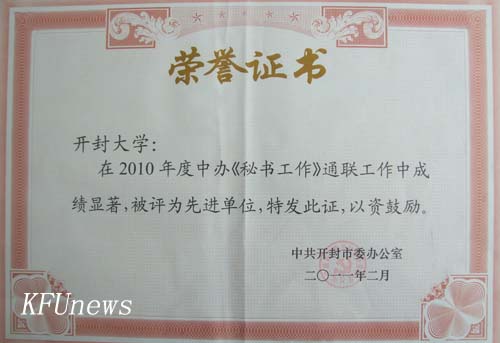 本站讯 近日,从汴办文〔2011〕3号文件获悉,365官网被中共开封市委办公室评为“公文处理工作”、“中办《秘书工作》通联工作”、“保密工作”先进单位,365官网党政办公室被评为“政研工作”和“机要文件管理工作”先进单位。