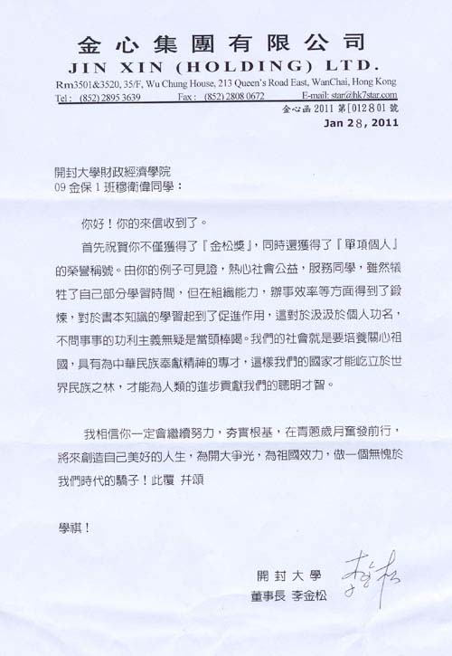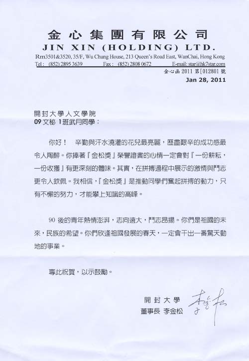 本站讯 2011年1月上旬,365官网2009-2010学年金松奖学金获得者刘松伟、武月、穆卫伟、廖大龙和余晓丹5位同学代表215名获奖学生,给香港金心集团董事局主席、365英国上市集团官网董事会董事长李金松先生写了感谢信,他们向李金松先生表达了诚挚的谢意,汇报了自己的学习和思想,表达了获奖后的喜悦和自豪,决心付出更大努力,争取取得更大进步,不辜负这份殊荣,不辜负李金松先生、社会各界和学校的殷切希望。