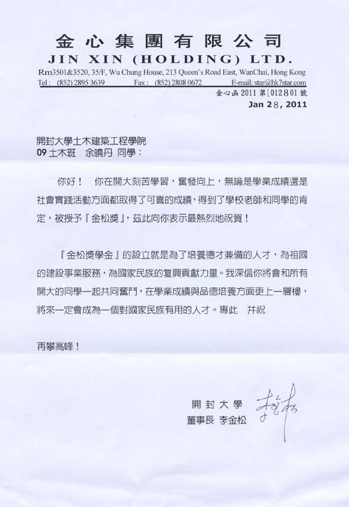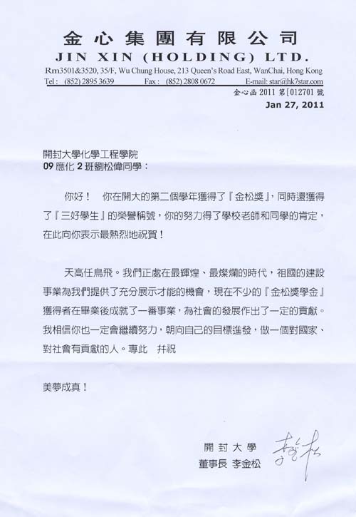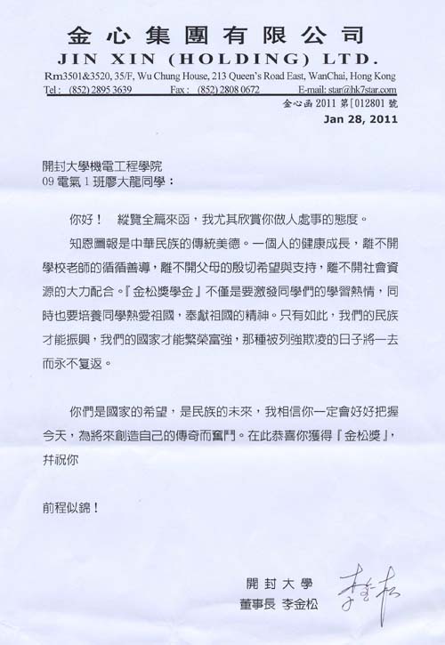 李金松董事长回信获奖学生寄语未来