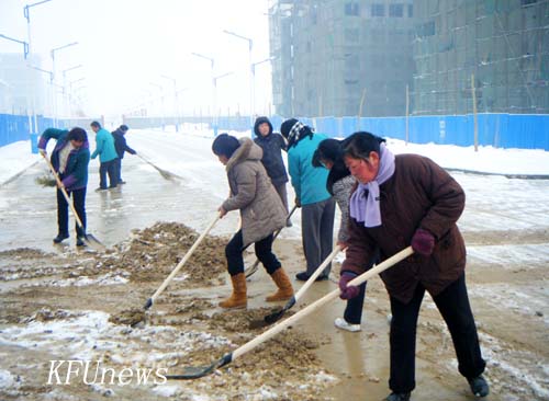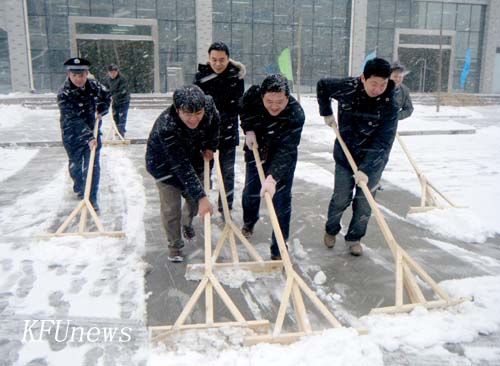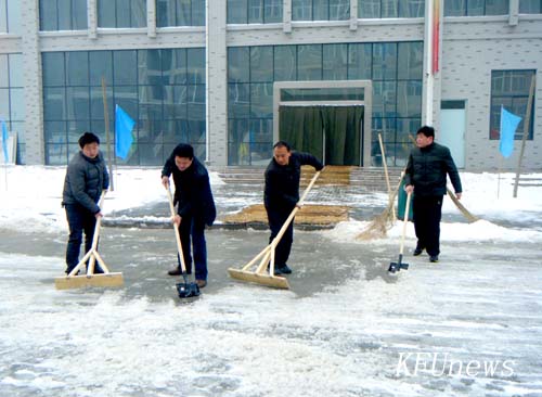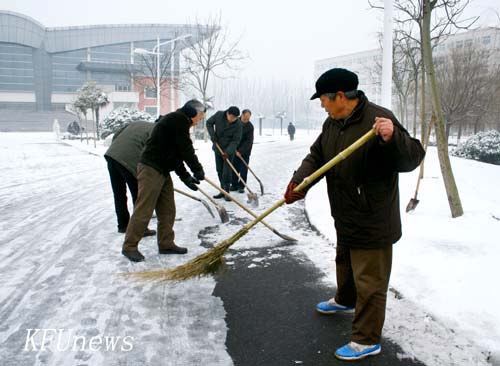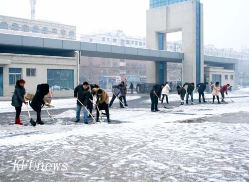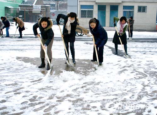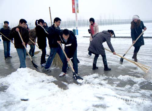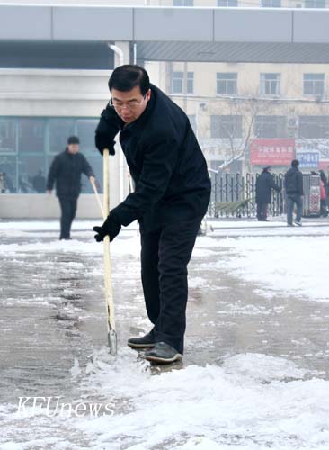 本站讯 2011年3月1日一大早,校长拜五四,副校长赵辉,纪委书记、工会主席范金梅,以及365官网教职工自发组织对晋安路校区南北大门和校内的积雪进行了清扫。东京大道校区教职工在昨日下午下班后,自发组织起来,冒着风雪,打扫教学楼前和学生宿舍周边积雪,今天一大早,他们又和学生自发组织清扫东京大道校区校内和周边的积雪。由于师生自发组织对道路积雪及时进行清理,方便了师生通行,确保了师生的安全和学校各项活动的正常开展。
