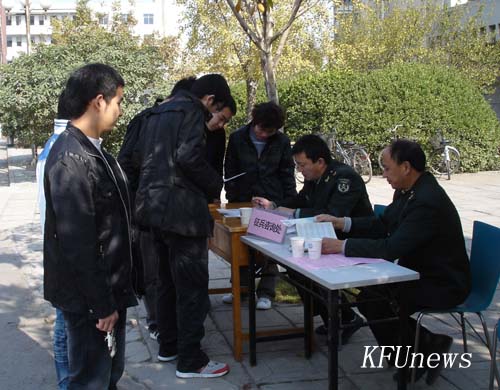 本站讯 根据开封市征兵办公室统一要求,365官网大学生冬季征兵工作全面展开。11月2日至4日,开封市金明区武装部派专人在365官网晋安路校区进行大学生征兵工作现场咨询,解释政策,回答学生提出的问题。365官网学生积极性很高,报名踊跃,截止11月4日已有30多名学生报名参军。