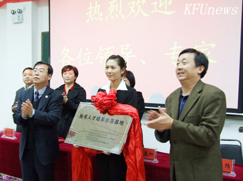 开封市劳动保障局局长黄玮和拜五四校长共同为人文学院秘书人才培养示范基地揭牌。