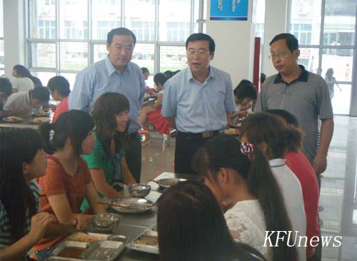 拜校长在新校区管委会主任、校党委副书记、副校长储建新和新校区综管办主任侯彦喜的陪同下首先来到学生餐厅查看了食堂的总体情况,并深入到学生中间,和同学们亲切交谈,仔细聆听同学们的意见,向同学们询问饮食和生活情况,并和同学们共同就餐,使同学们深切感受到校领导对同学们入住新校区后的关怀之情。