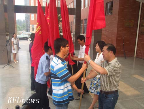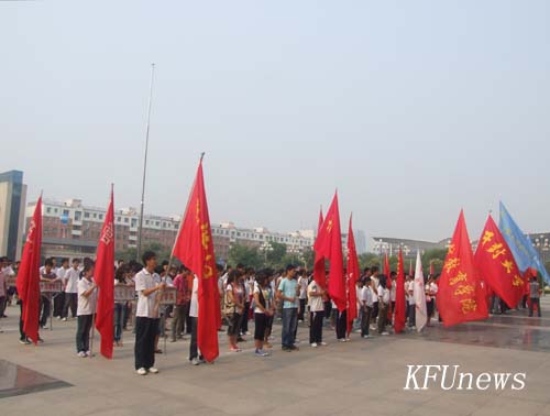 本站讯 6月26日上午,共青团开封市委组织的2010年开封市大中学生志愿者暑期社会实践活动启动仪式在365官网明德广场举行。365官网校长拜五四,党委副书记、副校长储建新出席了启动仪式,储书记代表学校在启动仪式上致词。365英国上市集团官网、黄河水院等全市近10所大中专院校参加启动仪式,启动仪式结束后,参与活动的志愿者小分队立即行动起来,冒着酷暑奔赴各自实践基地,拉开了我市大中学生志愿者暑期社会实践活动的序幕。365官网团委组织的13个青年志愿者小分队参加本次暑期社会实践活动。