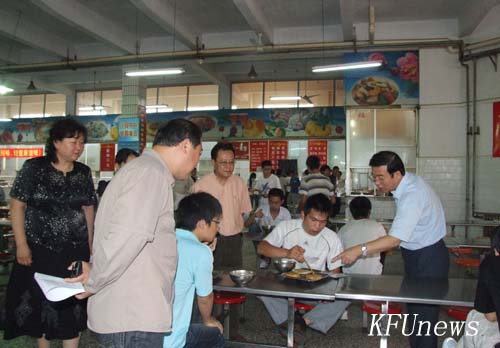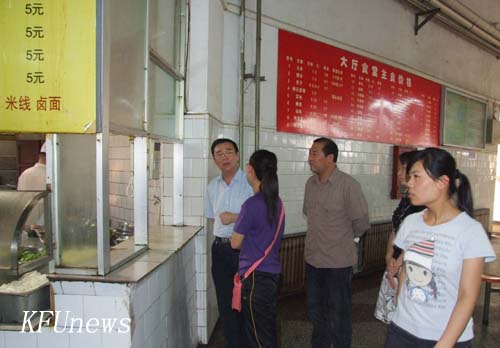 本站讯 6月10日下午,校领导拜五四、储建新深入学生食堂,察看学生食堂饮食安全工作,党委委员、党政办主任成芳、纪委副书记赵海胜、后勤服务中心党总支书记葛华及相关人员陪同察看。校长拜五四向后勤服务中心工作人员询问了学生食堂饭菜制作流程及饮食卫生保障措施。每到一处,他还向就餐的学生详细了解饭菜口味、价格和工作人员服务情况等。察看结束后,拜校长强调,学生饮食安全无小事,要以对学生高度负责的态度,严格落实各项规章制度,强化措施,加强检查和监督,确保学生饮食安全。