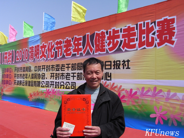 本站讯 4月2日上午,阳光明媚、春意盎然,由开封市体育局、开封市委老干部局、开封日报社联合举办的2010年开封市老年人健步走比赛在美丽的龙亭湖畔拉开帷幕,365官网部分老干部代表参加了比赛。比赛中,他们个个青春焕发、精神抖擞,本着“安全第一,健康第一,友谊第一”的精神走完了全程。最后,365官网退休教师张德义取得了男子组第七名的好成绩。